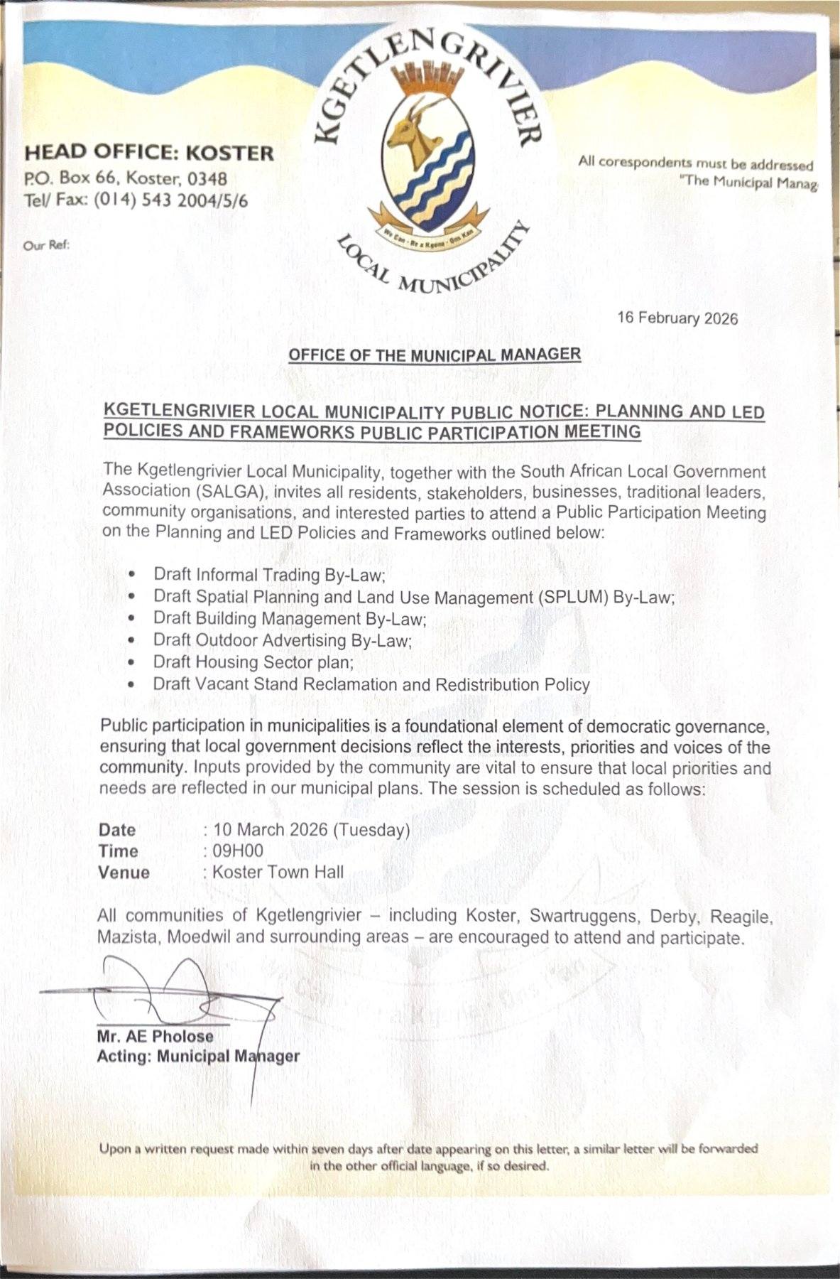 The Kgetlengrivier Local Municipality, in partnership with the South African Local Government Association (SALGA), invites all residents, stakeholders, businesses, traditional leaders, community organisations, and interested parties to participate in the review and consultation process for several important draft policies and by-laws.