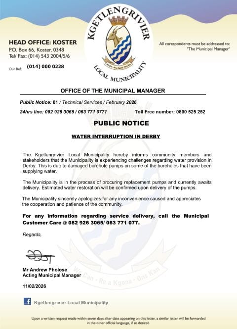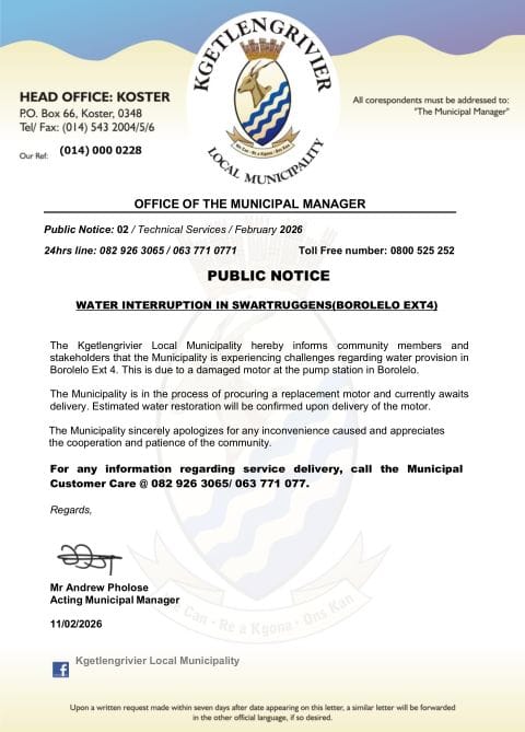The Kgetlengrivier Local Municipality hereby informs all community members and stakeholders of ongoing water supply challenges affecting residents in Derby and Swartruggens (Borolelo Ext 4).